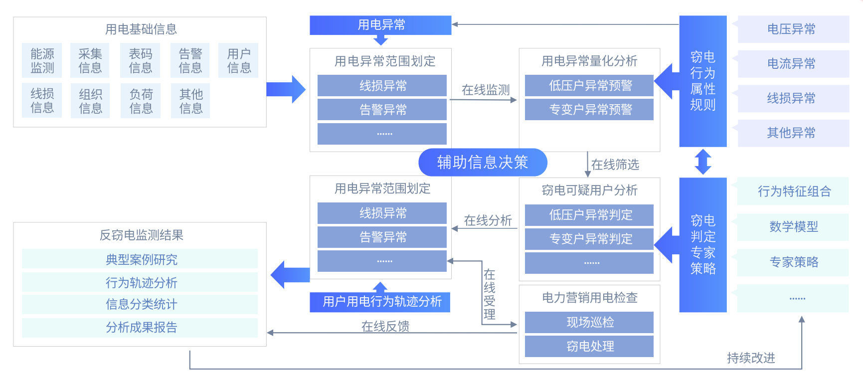 运用大数据技术融合营销、计量(用采)、 配网以及客户服务等主题的海量数据,通过实时/准实时计算分析数据之间的内在关联性、逻辑关系和数据表征,建立一套科学、精确的数学模型和分析方法,实现智能化的异常监测 、跟踪定位和分析诊断,最终为有效反窃电提供系统化、智能化、自动化手段。