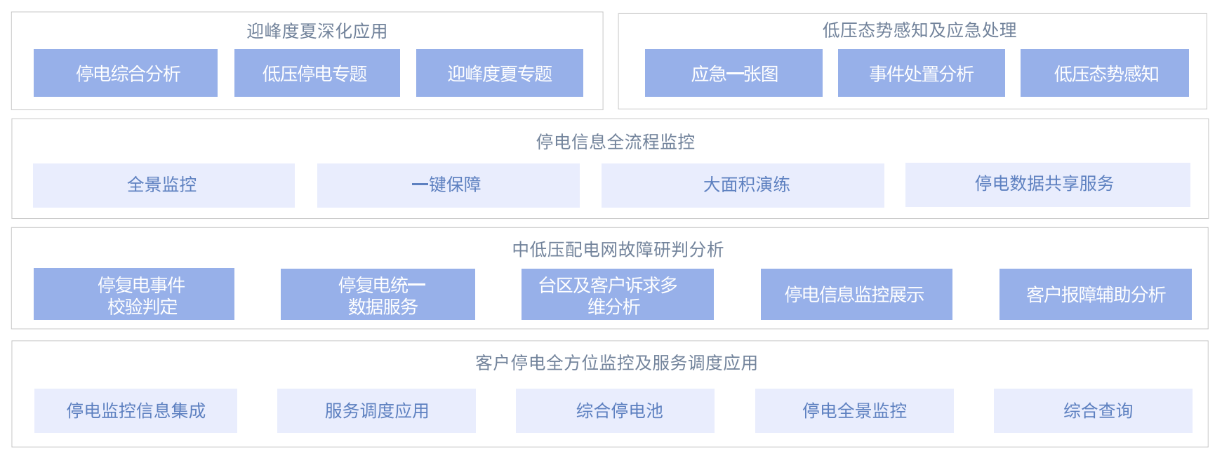 基于统一电网模型,汇集生产、营销、客服、调度等系统数据,解决配网停电全过程的监控和分析要求, 满足服务调度对停电监控的日常工作要求,以客户为中心,实现停电实时监控、历史停电记录查看、停 电指标统计、热点停电地区分析、停电通影响范围统计,完善提高客户服务质量、提升客户满意度,实 现配网停电管控从“信息化专业支撑”走向“数字化业务赋能”,推动企业的高质量发展。