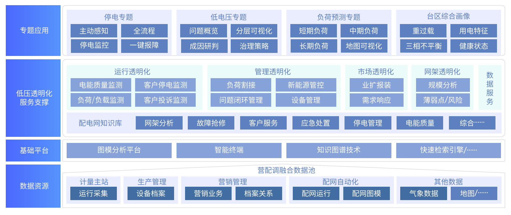 上承国家《关于新形势下配电网高质量发展的指导意见》提出的建设任务要求,下接低压配电网建设发 展实际工作需要,从实际业务出发规划低压配电网全域透明化管理工作,落成信息化支撑平台。核心内 容包括营配调数据资源融合池、基础技术支撑、低压透明化业务服务支撑、业务场景专题应用的四个方 面实现低压配电网建设与管理工作全面覆盖。宏观对配电网规划决策提供“一张图”模式的全景管控,微观落地到对低压配电网停电管理、低电压管理、负荷管理、三相不平衡管理等具体执行工作的技术支 撑。
