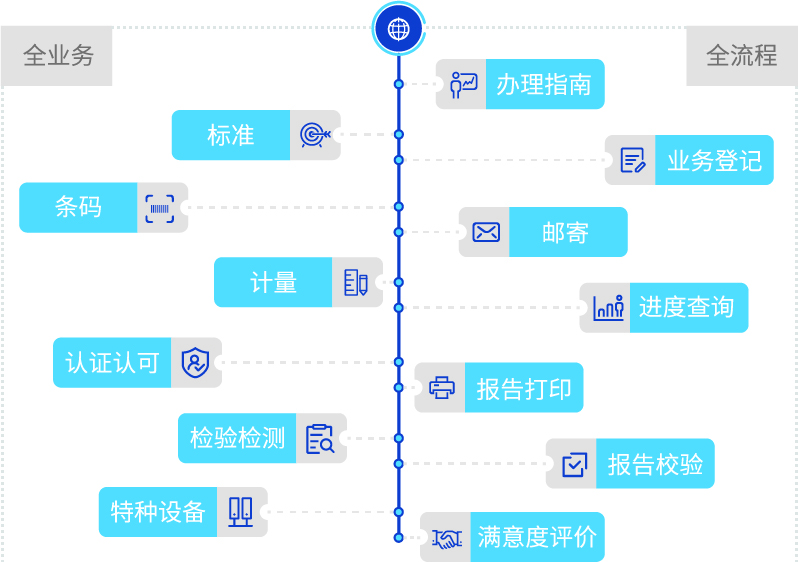 通过建立业务登记、预约服务、进度查询、网上收费、报告打印、物流查询、满意度评价等工作流程,实现计量、检验、特种设备、条码业务的全程网上办理,标准、认证认可、知识产权等业务网上转接办理,满足企业便捷高效的服务需求。