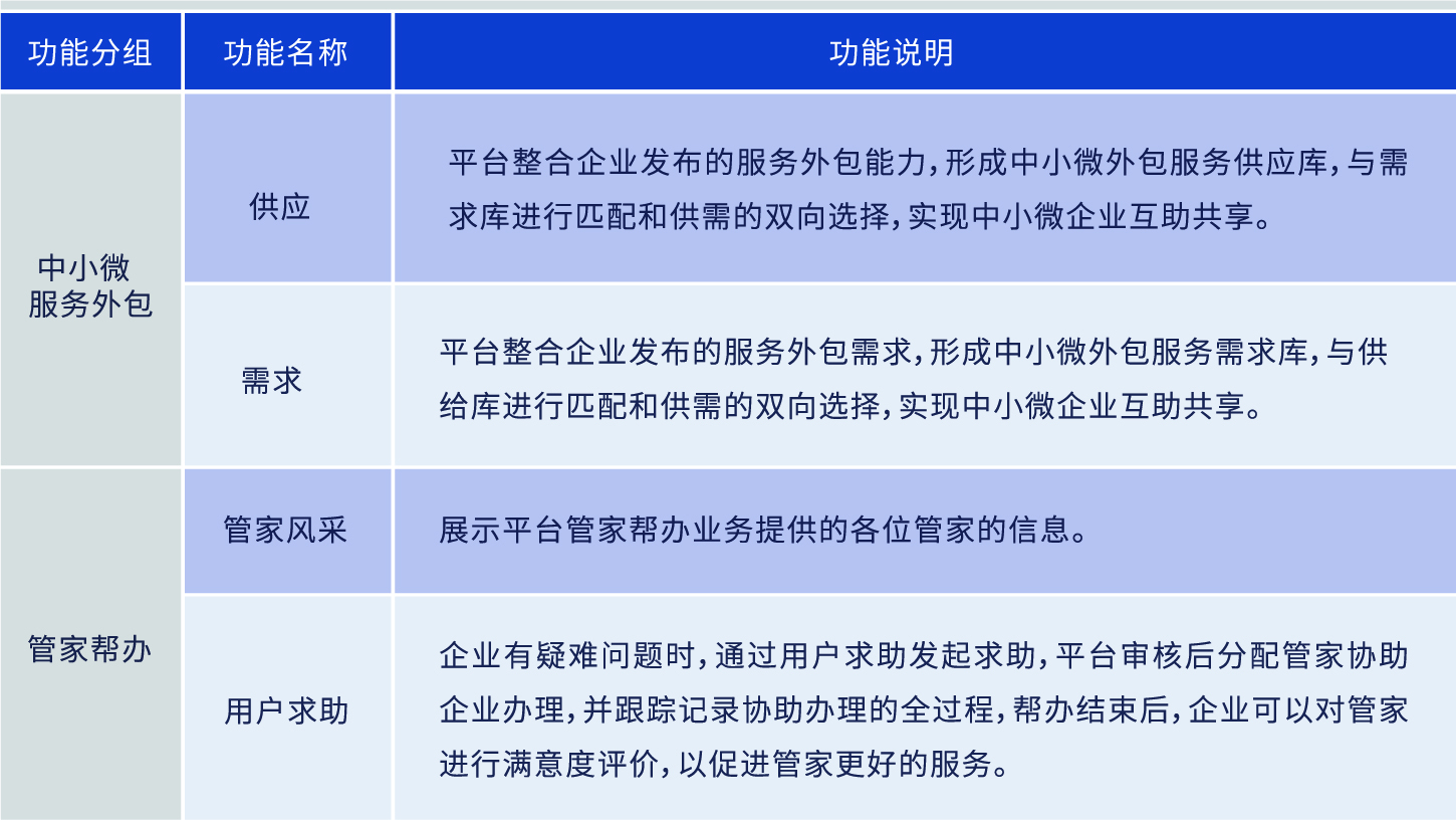 为中小微企业提供服务外包和管家帮办援助。服务外包方面。NQI援助站供需双方分别发布供给能力和生产需求,通过平台精准匹配和供需双方的双向选择,实现中小微企业的互助、共享。管家帮办方面。对疑难问题,分配管家为企业办理,全程跟踪、记录、总结,接受企业满意度评价。