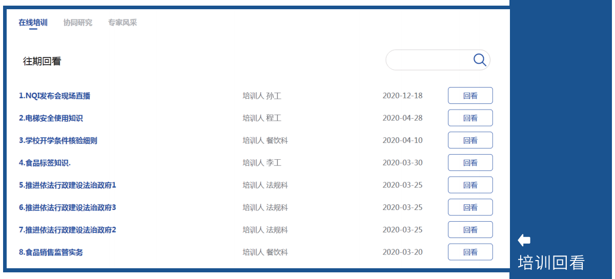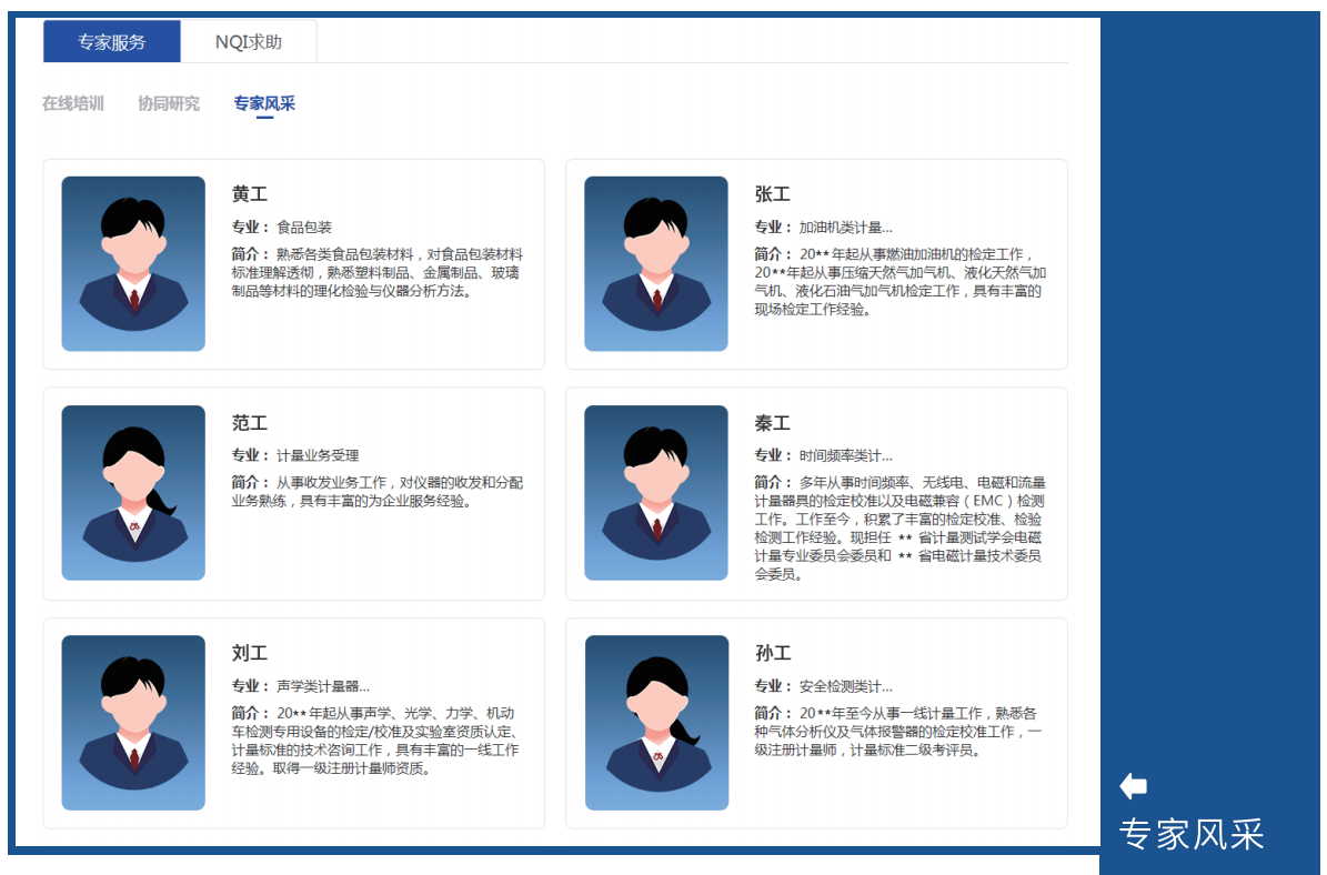 为企业提供专家服务和NQI求助。专家服务方面。企业可以通过协同研究、在线培训、在线会议、预约服务等多种渠道,实现与各领域专家的互动,解决生产经营难题。NQI求助方面。分行业、分领域搭建NQI求助园地,集中大家智慧,解决求助问题。