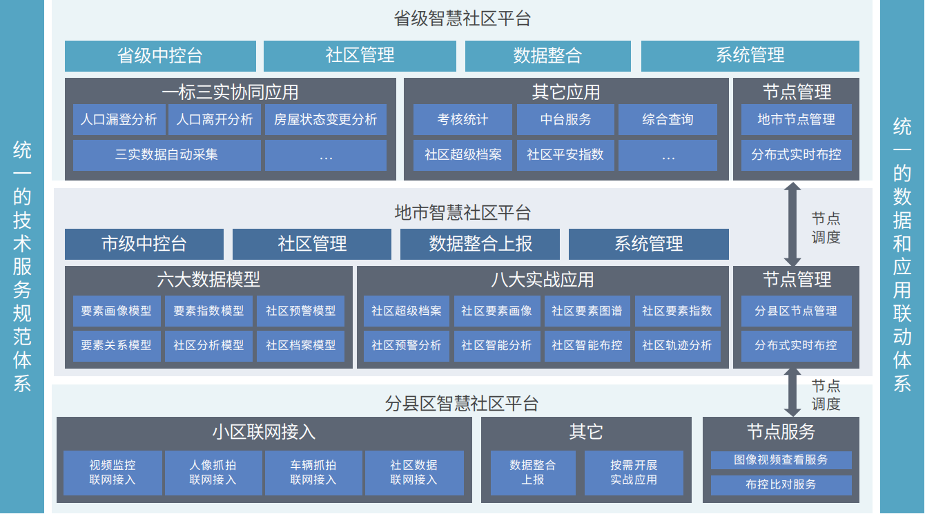 智慧社区平台充分利用大数据、人工智能、物联网等新技术,利用各类感知设备构建智慧小区, 自动采集各类数据,结合公安数据中心掌握的各类警情、案件数据,构建大数据中心智慧社区专题库,并进行智能分类处理、关联、分析实现数据的统一智能管理, 建立预警模型及相关服务。
