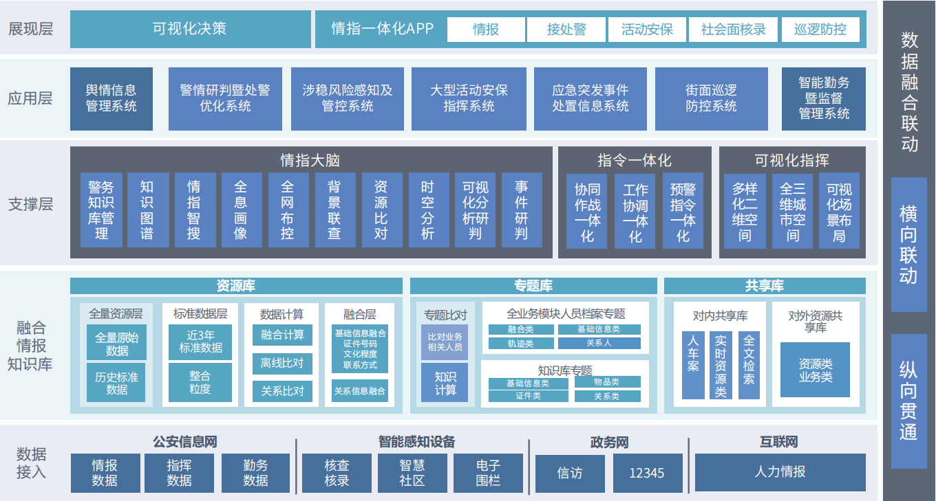 情指一体化综合实战平台按照“情指一 体化1+1>2”的总体思路,依托警务云的各类数据资源,将情报、指挥、勤务、行动 等业务应用进行高度融合,以“ 情 指 大 脑”、“指令一体化”、“警务要素可视化”为核心,支撑处警优化 、社会维稳 、巡逻防控、活动安保、应急处置等业务应用场景。 最终实现公安 “看得见、呼得通、调得动、 能研判、防得住”的警务实战新需求。