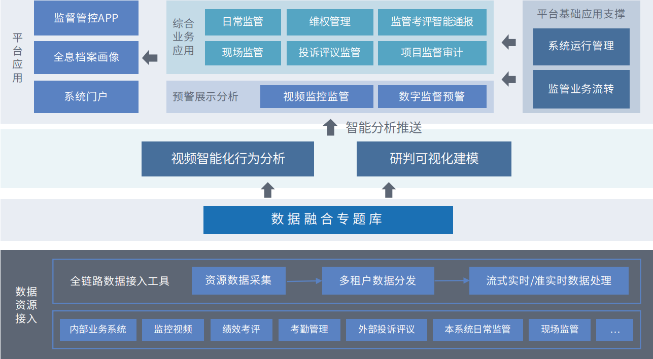 大监督一体化管控平台把“执法监督、依法行政、内部监督”的智能化监督作为系统建设的主线,实现检测预防、提醒自纠、 分析研判、线索倒查和责任追究,从而全面提升监督效能。