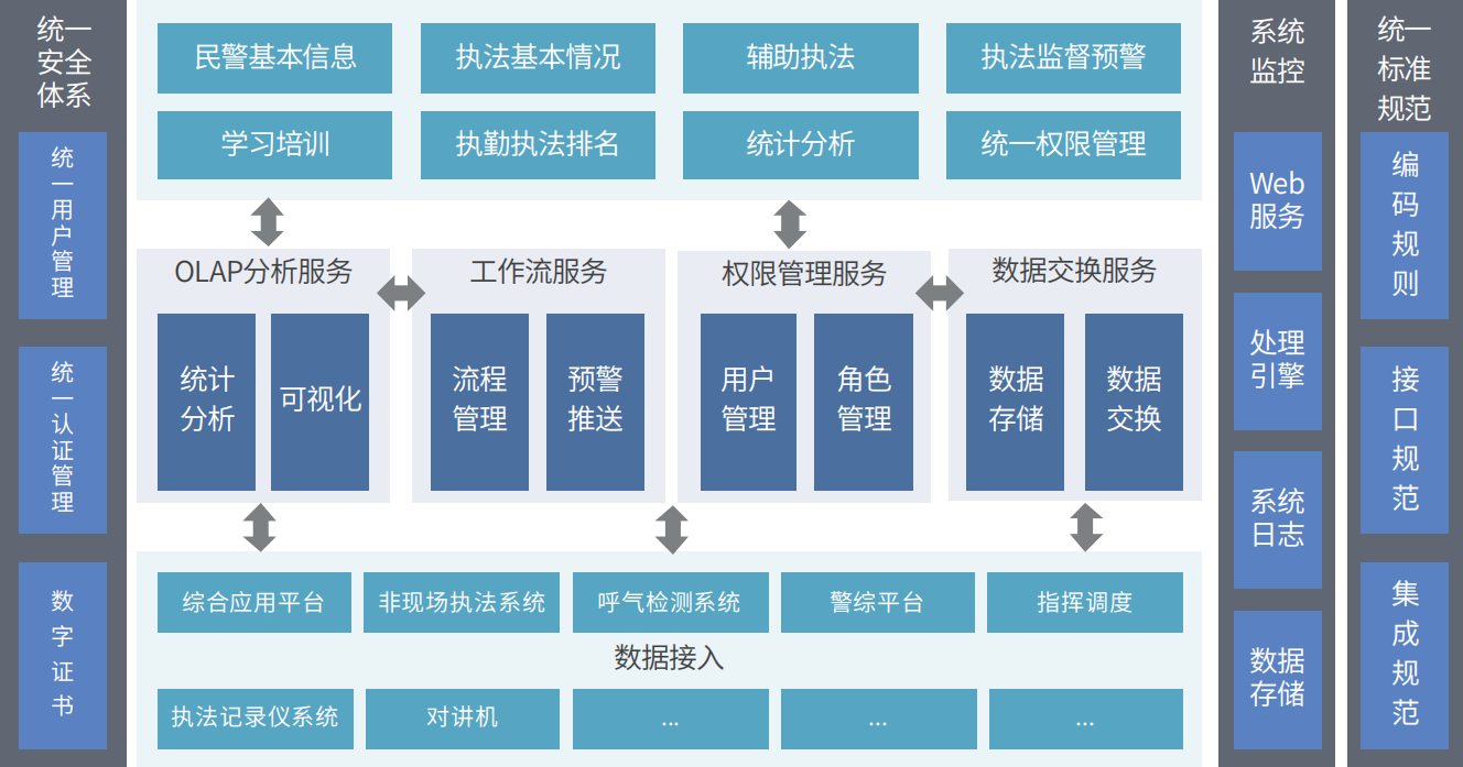 1. 应用大数据技术集成执勤、执法相关各系统的结构化、非结构化数据,完成相应积分计算、执法监督预警预警等。